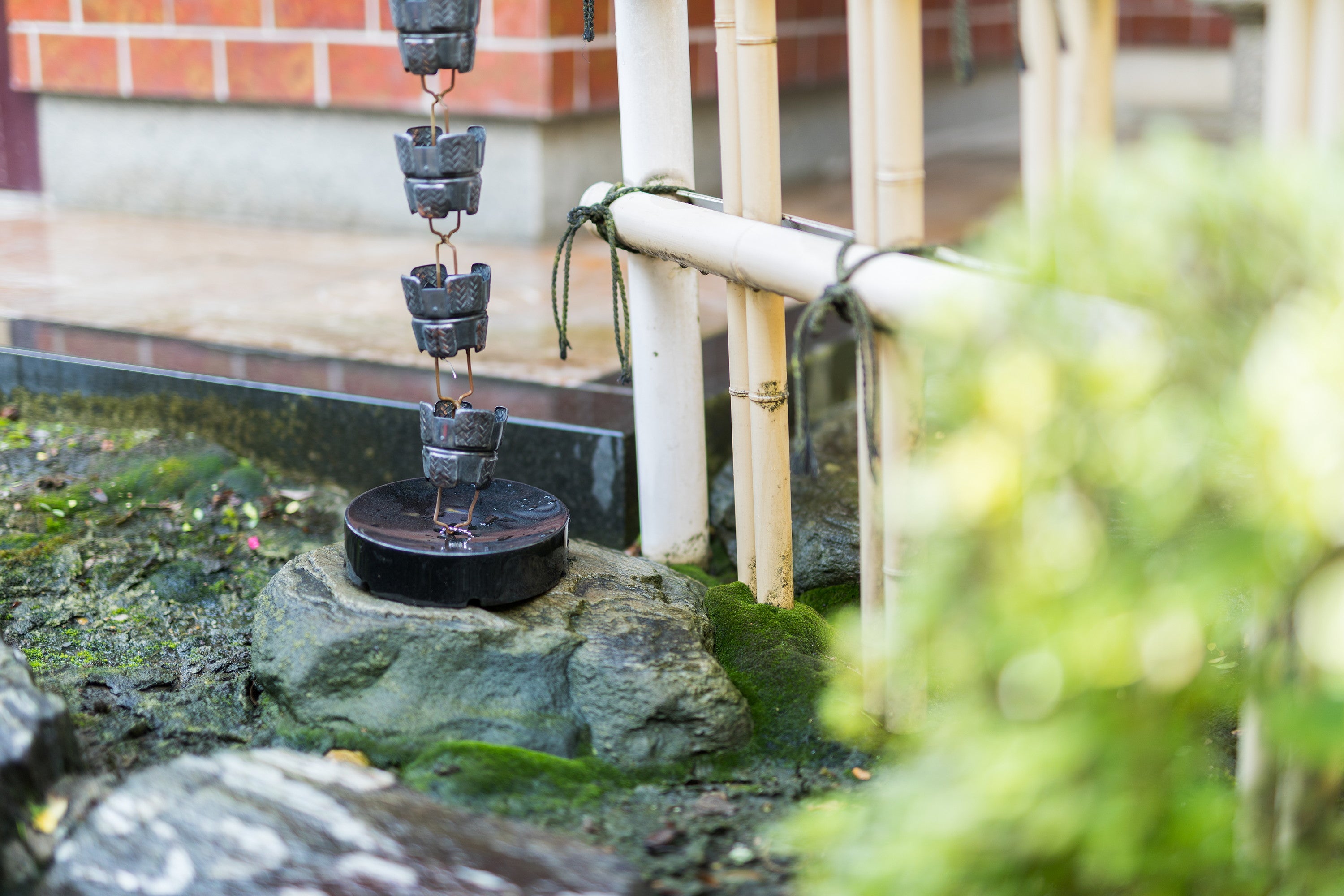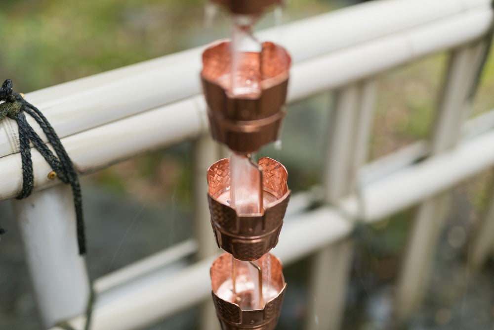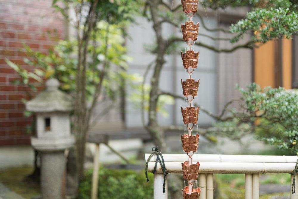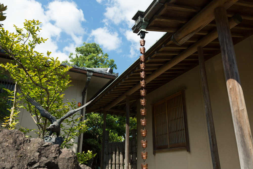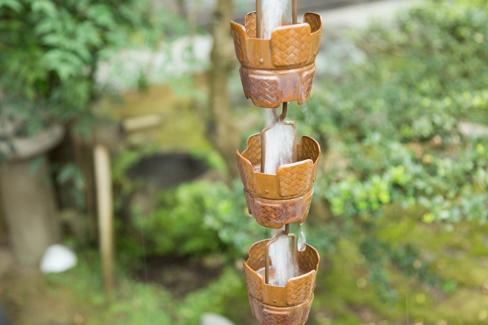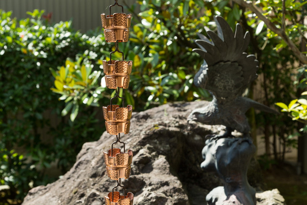 Ajiro is a copper rain chain made of cups with a woven pattern. Its appearance blends naturally with wood, stone, and gardens, making it a great fit for homes with greenery. As you continue to use it, the copper will age and change color, becoming a beautiful and permanent part of your home's exterior.