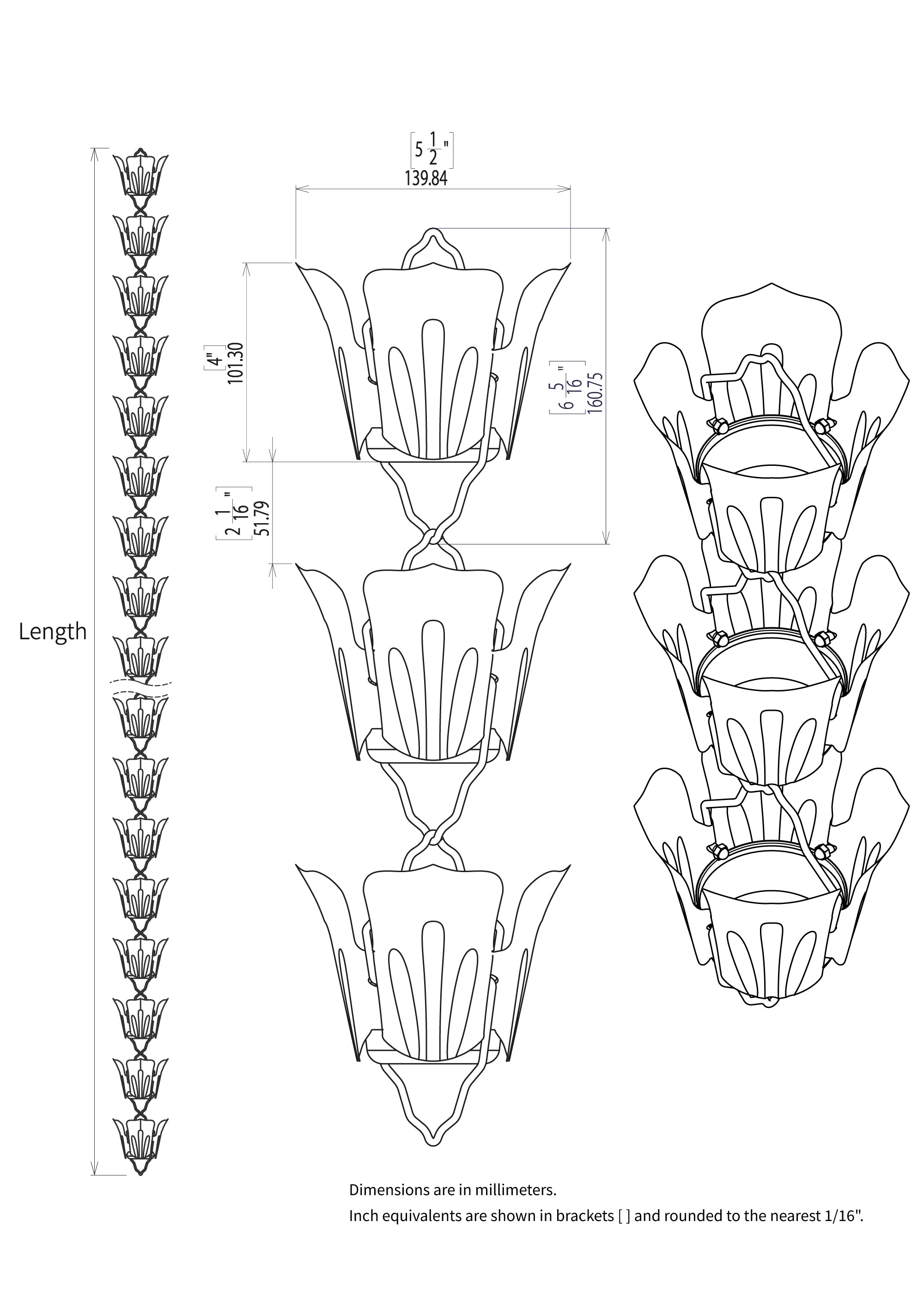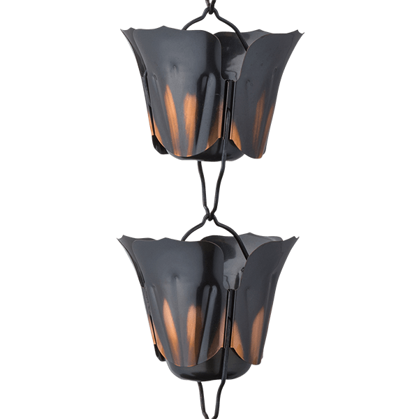 Overlapping outlines create depth in your space. It has a strong presence on both rainy and sunny days. Some call this style a flower rain chain or fluted cup. It reflects light softly.