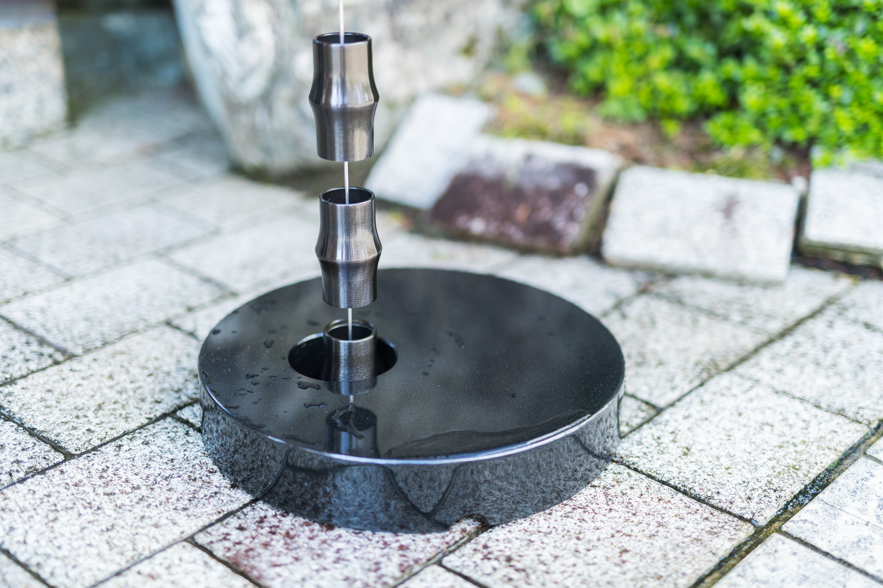 Ta-ke is a rain chain made of linked parts shaped like the nodes of bamboo. The calm Dark Brown finish defines the shape of the links, adding a quiet presence to the straight vertical line.