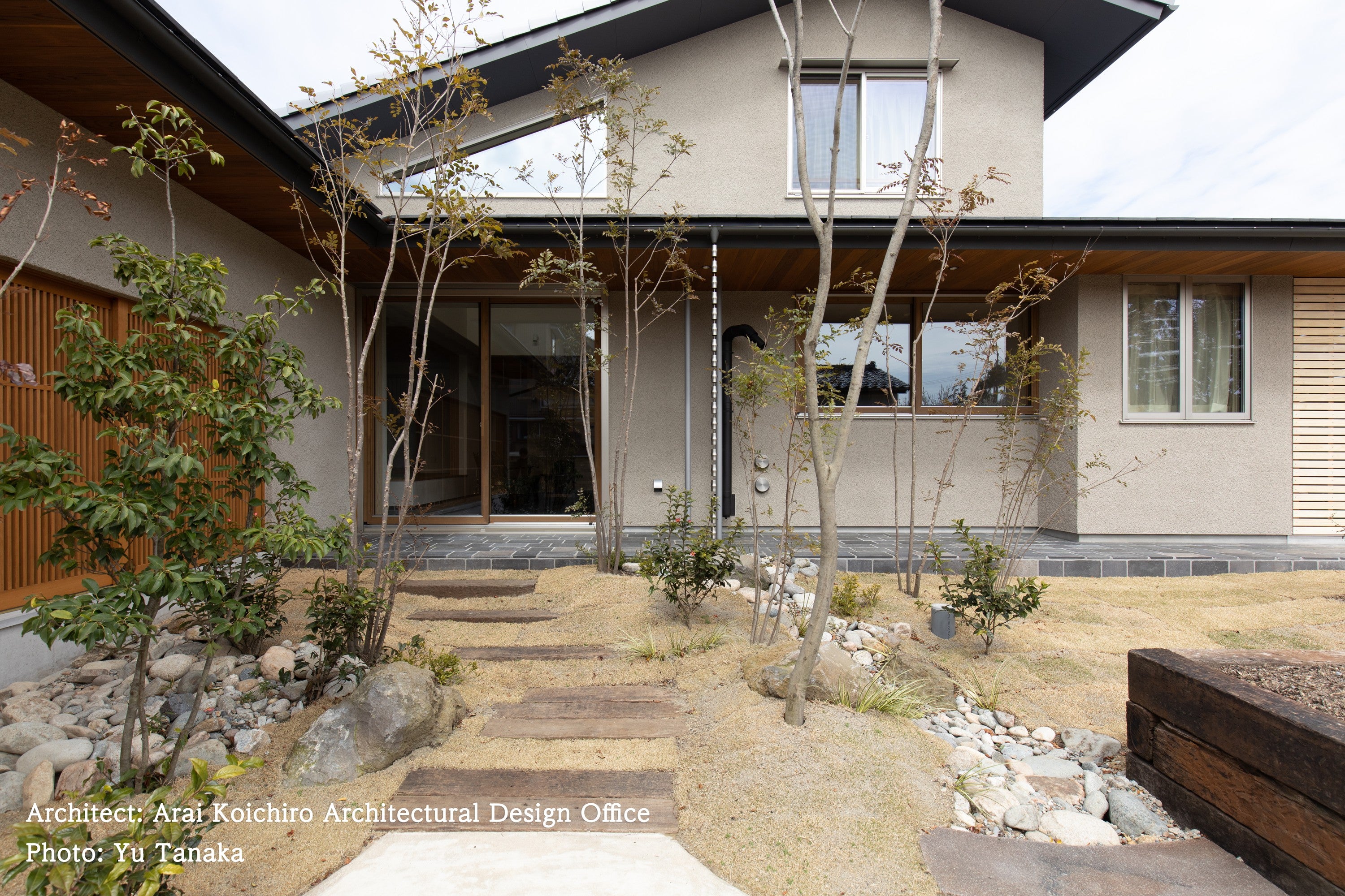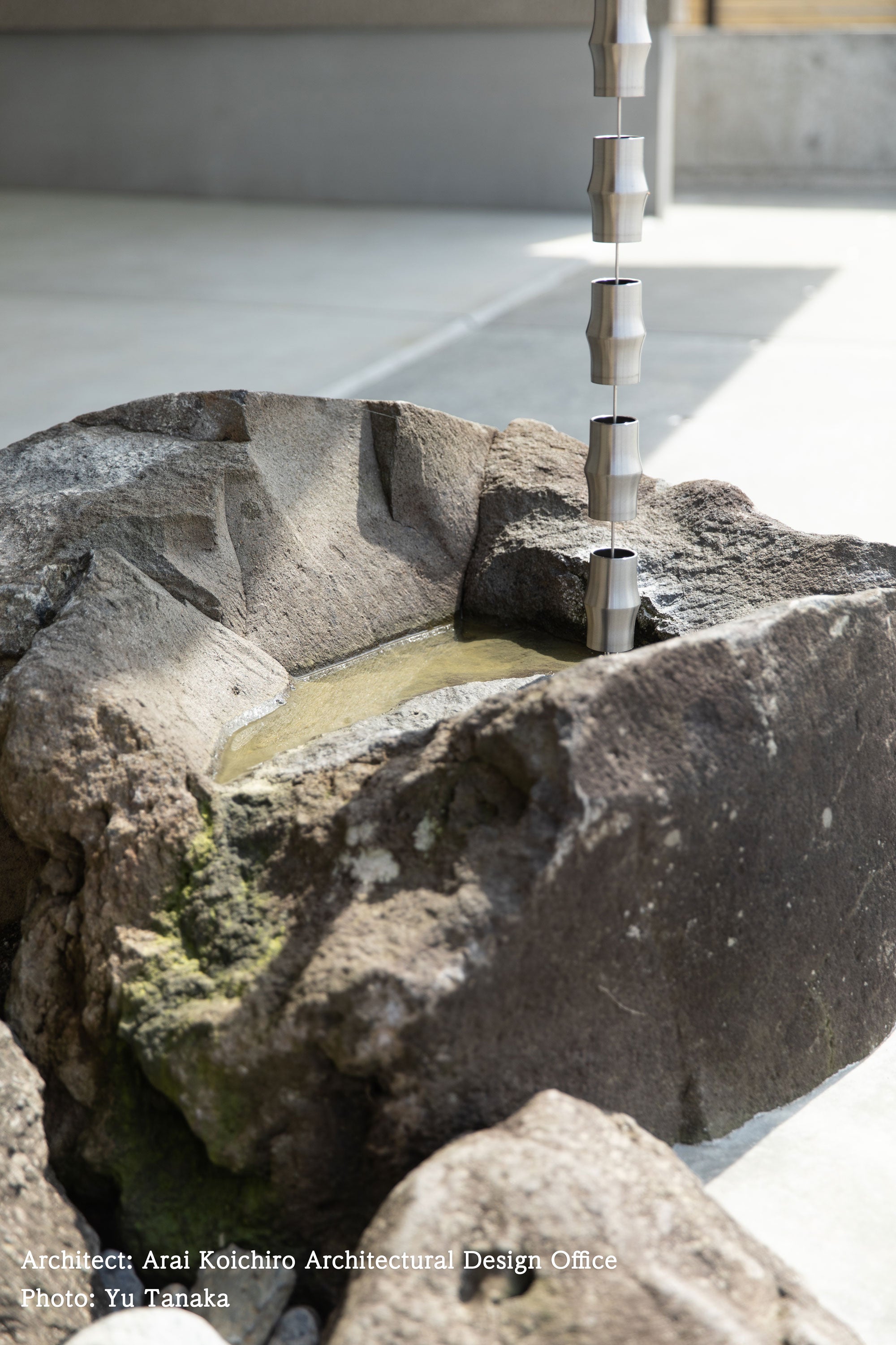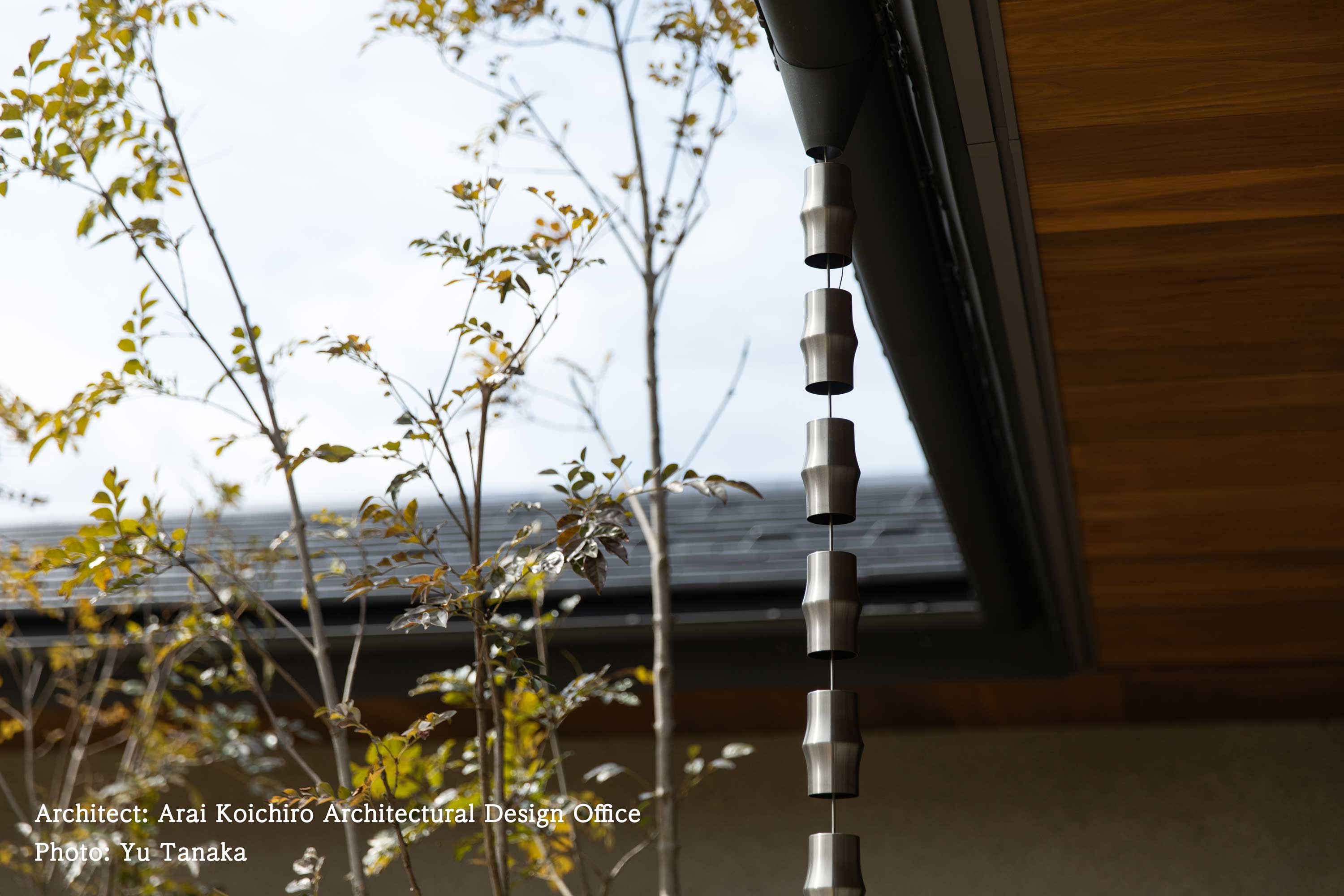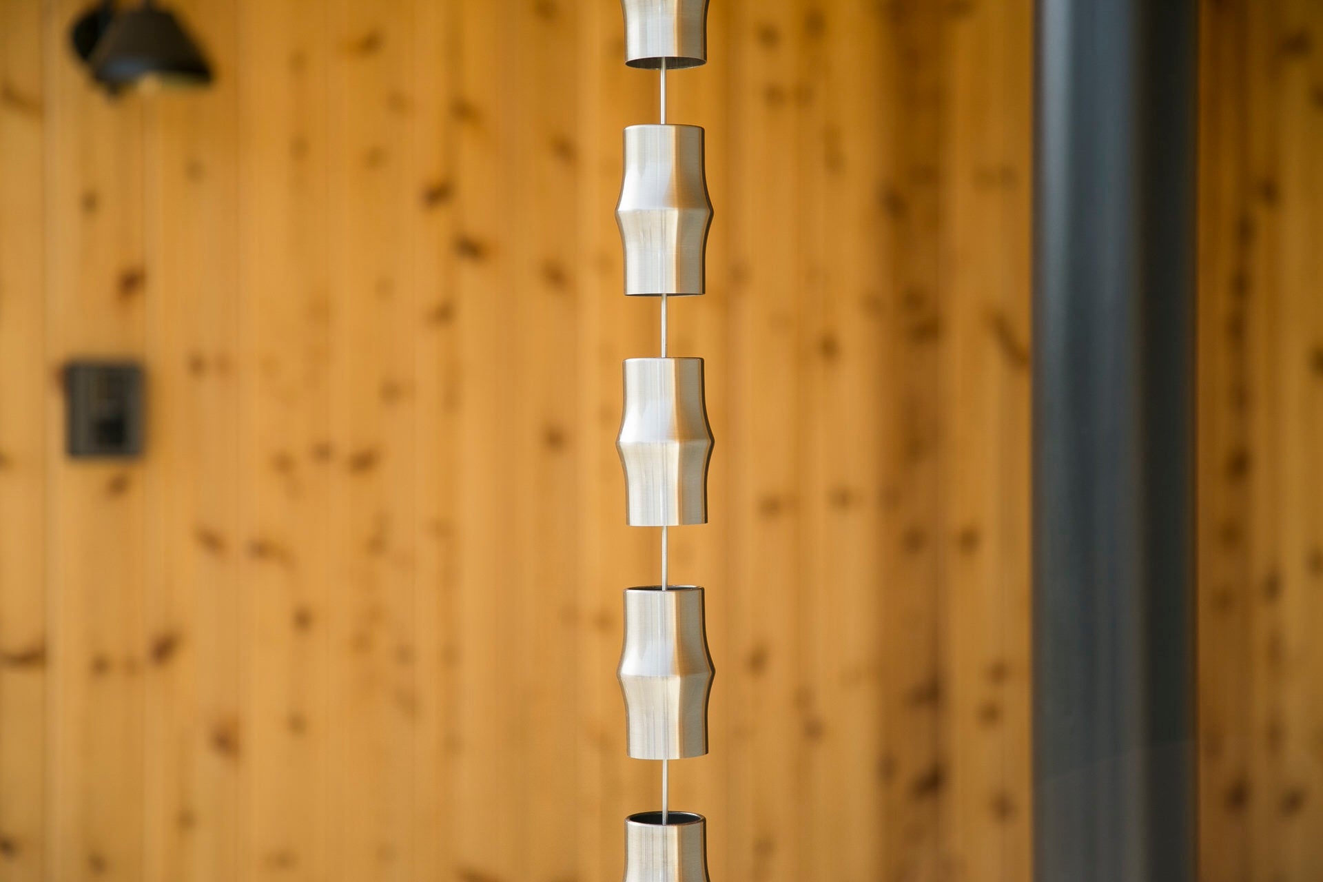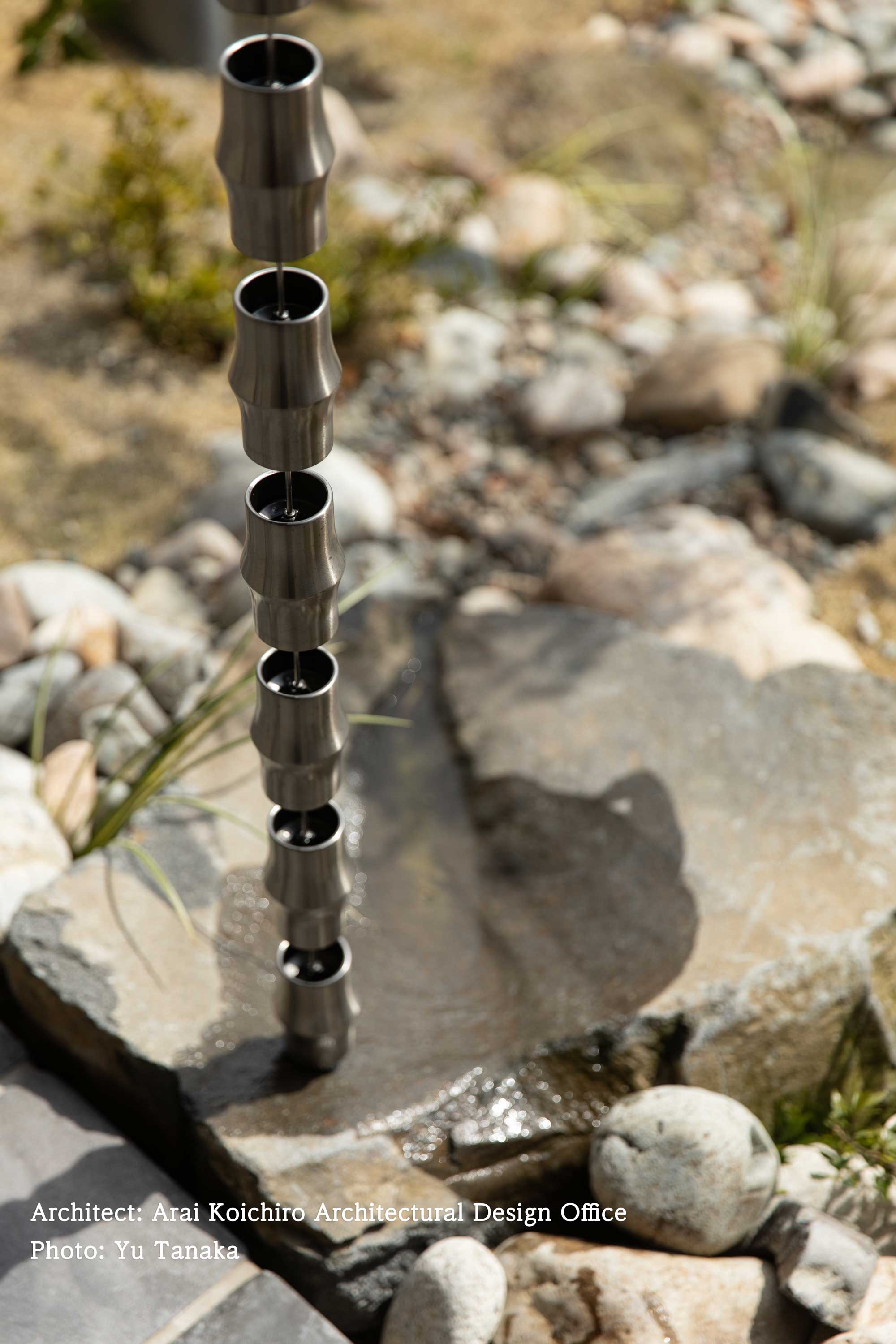 Ta-ke is a rain chain made of linked parts shaped like the nodes of bamboo. The repeated shape adds a gentle touch to the straight vertical line.